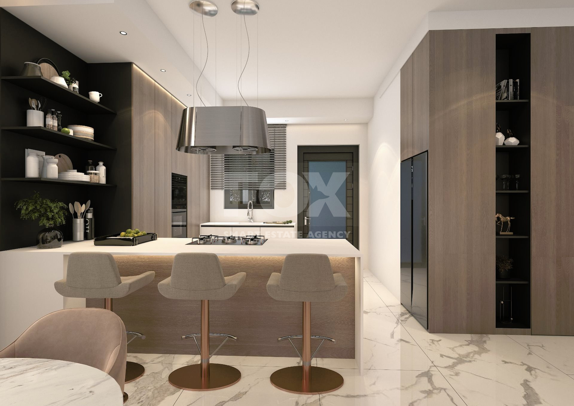 • Bathrooms finished with high quality marble effect porcelain tiles, suspended ceilings and high-quality vanity units, sanitary ware, accessories and mixers