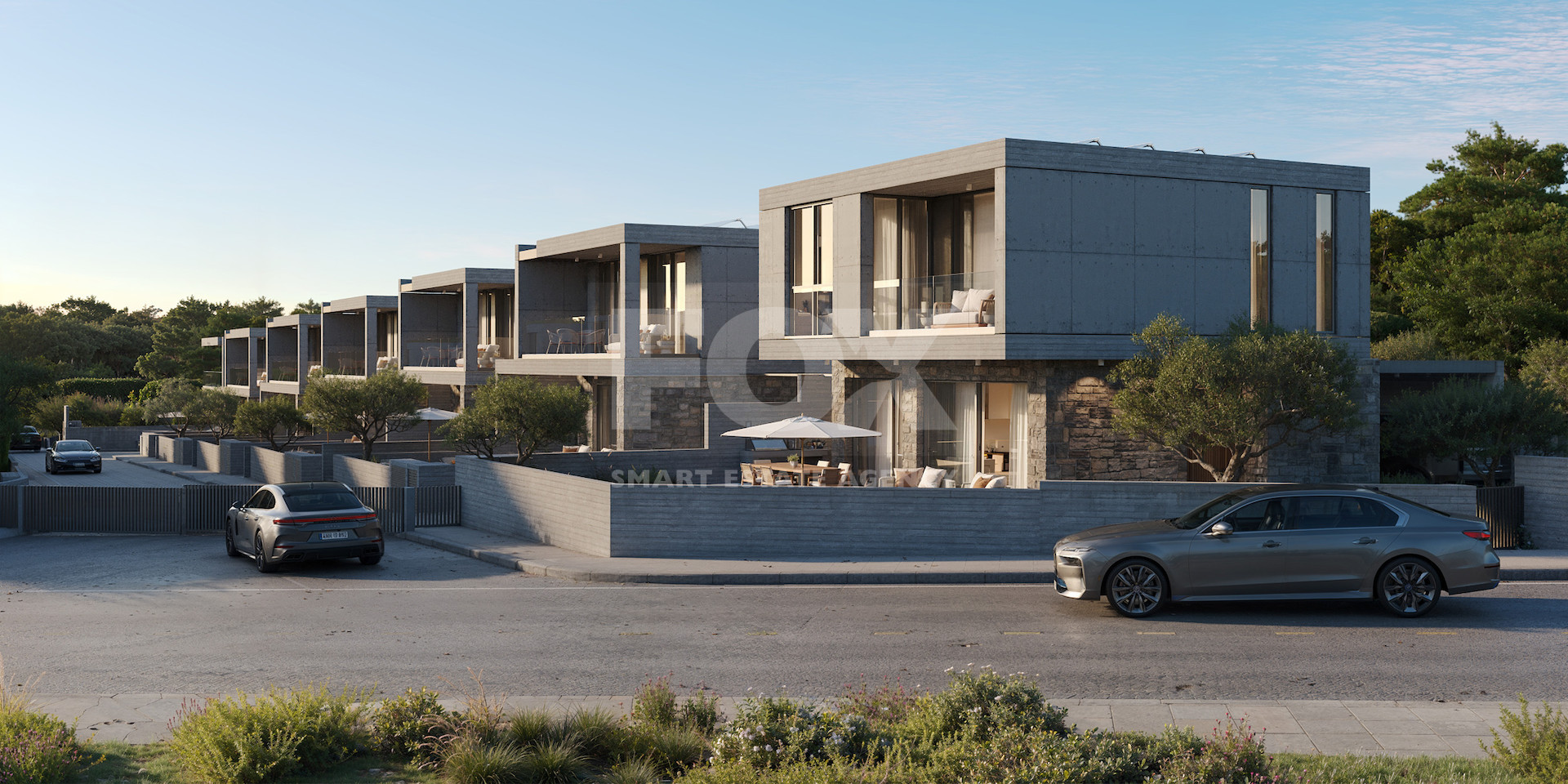 The villas showcase contemporary architectural design with clean lines, flat or gently sloped roofs, and a refined minimalist aesthetic. High-quality, sustainable materials such as natural stone, wood accents, and premium finishes are used throughout. Modern comforts are enhanced by energy-efficient systems, including split-unit air conditioning, solar energy provision, and smart home infrastructure.