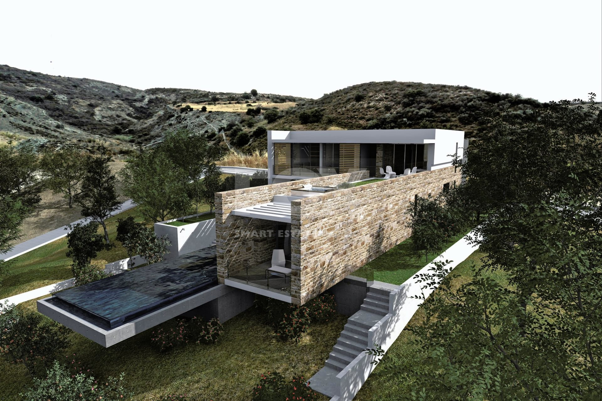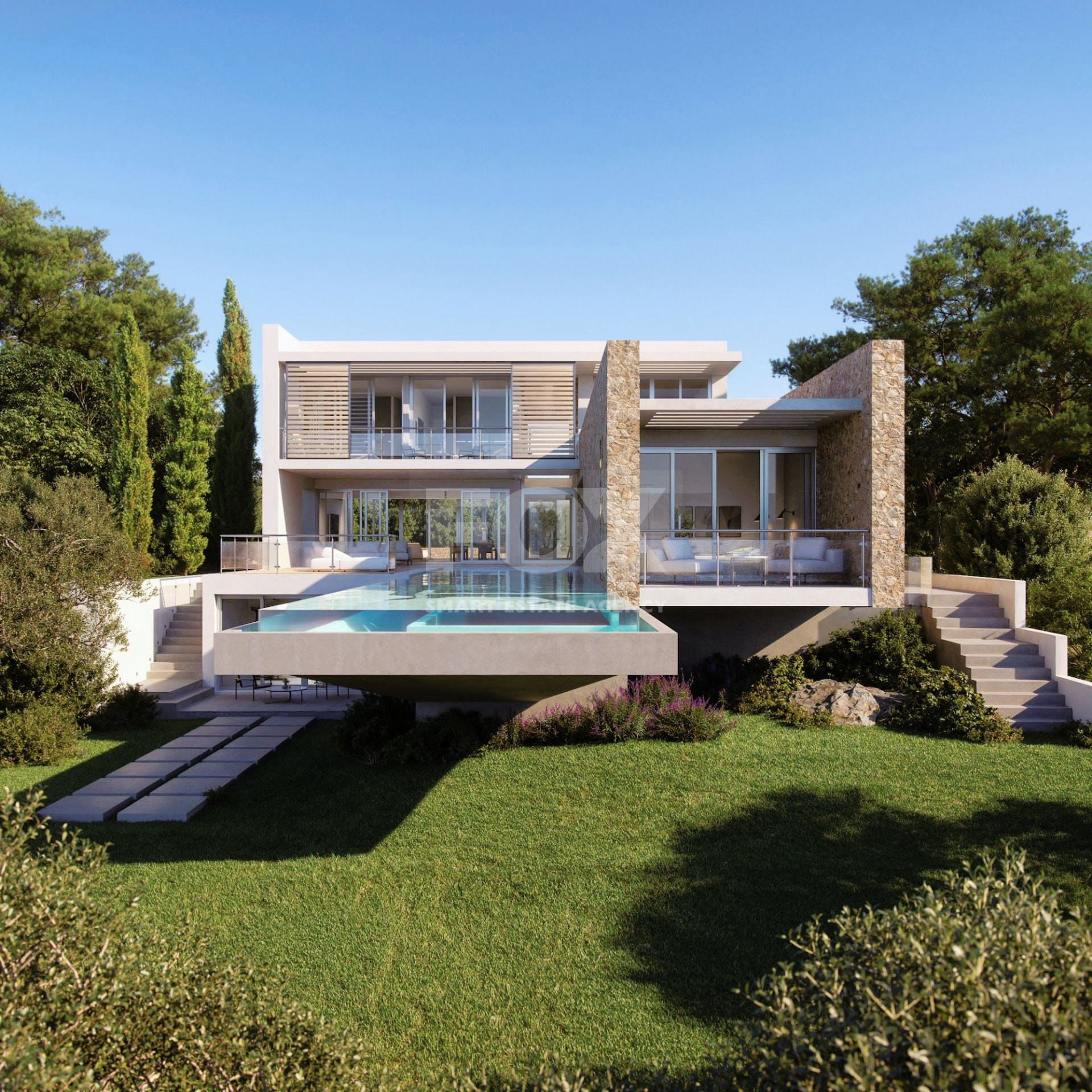 This stunning four-bedroom villa is located in the beautiful area of Konia and boasts incredible, uninterrupted views of the sea. The villa's design exemplifies luxurious living, built to the highest standards with meticulous attention to detail. Its minimalist architectural style exudes refined elegance, complemented by lush greenery, clear waters, and a glistening cityscape in the background.