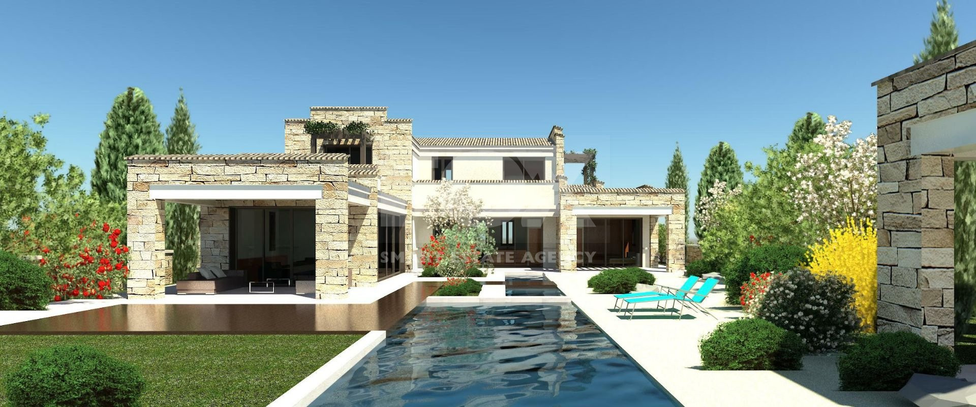 Designed in a contemporary Mediterranean style, the villa blends stone-clad facades, timber details, and clay-tiled roofs with modern open-plan living spaces. It offers a spacious internal covered area of approximately 225 square meters, with additional covered verandas and ancillary spaces that bring the total covered area to around 306 square meters. The property sits on a generous 1,134 square meter plot, featuring beautifully landscaped gardens, a private swimming pool, and ample outdoor entertaining areas.