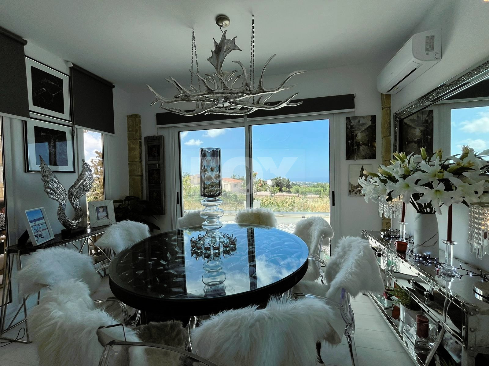 Additional features include a SAS alarm system, 5kw PV photovoltaic panels for solar power, and picturesque sea views.