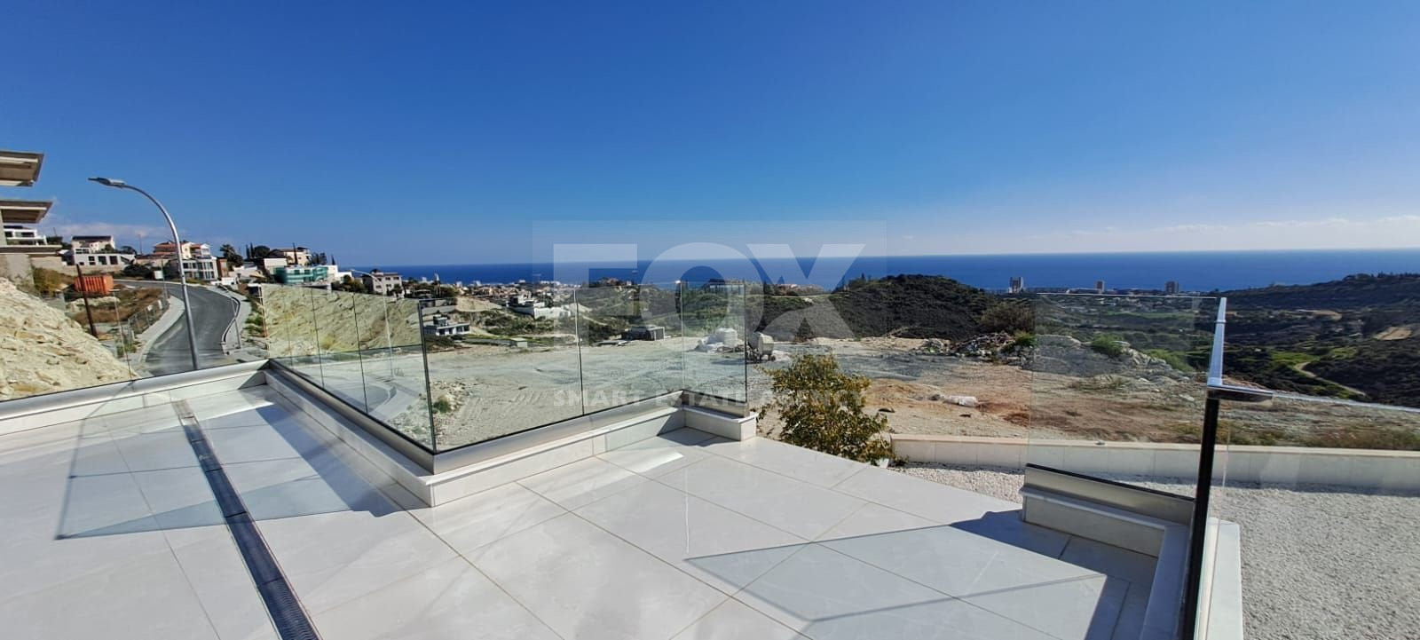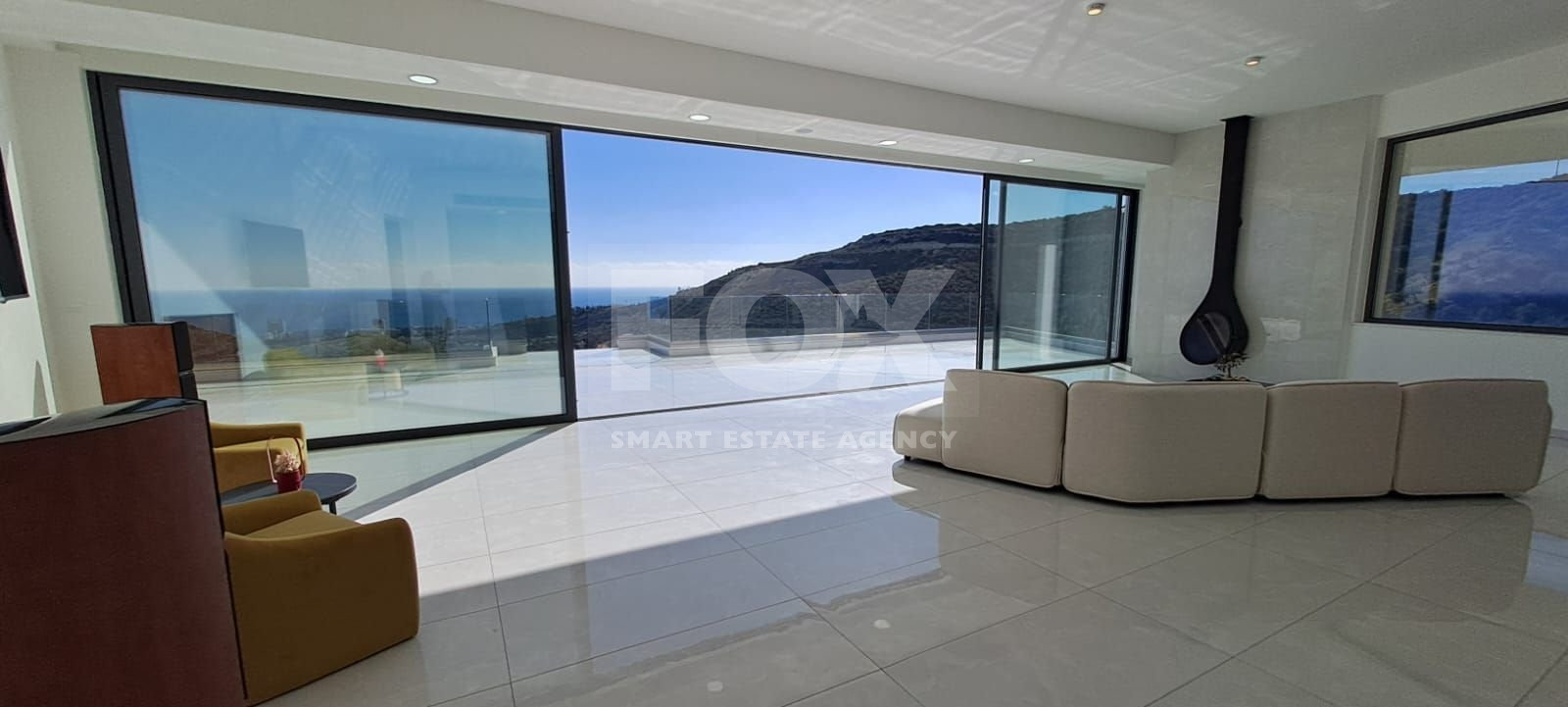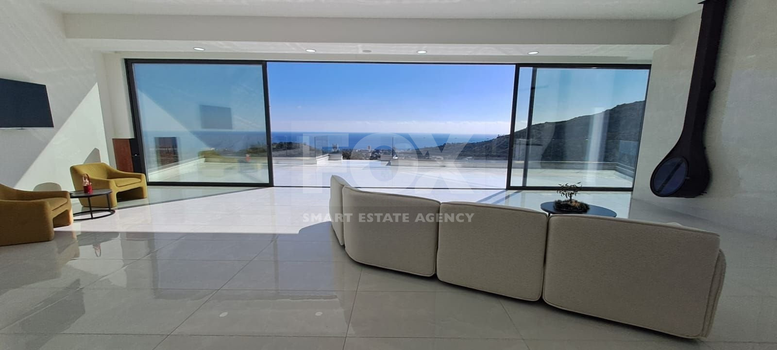 Middle Level: An open-plan dining and living area offering breathtaking sea and mountain views, a high-end Italian kitchen with a central island, a guest toilet, and a stunning 100 sq.m. veranda. A designer hanging fireplace adds to the elegance.