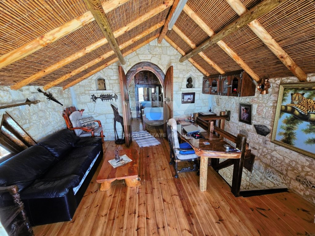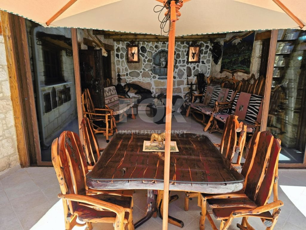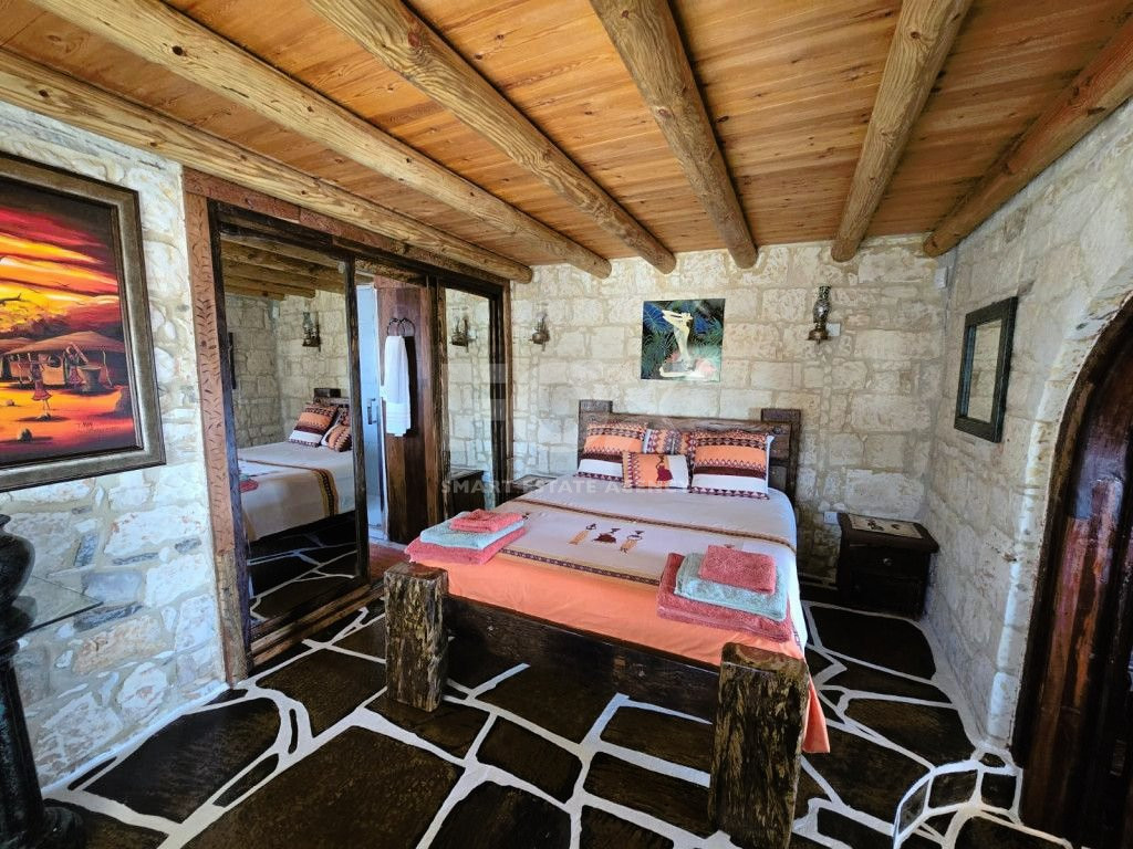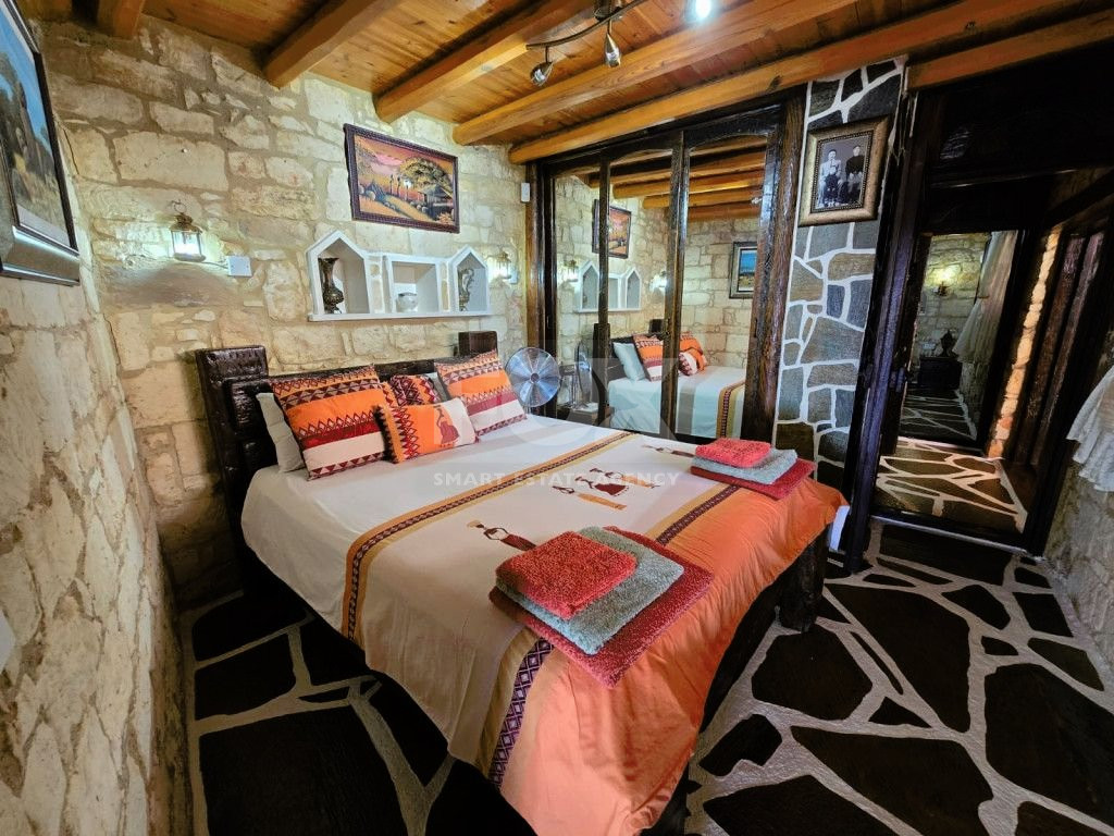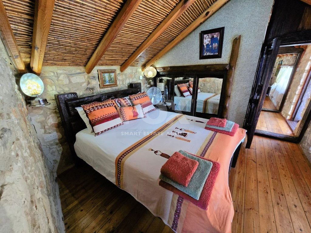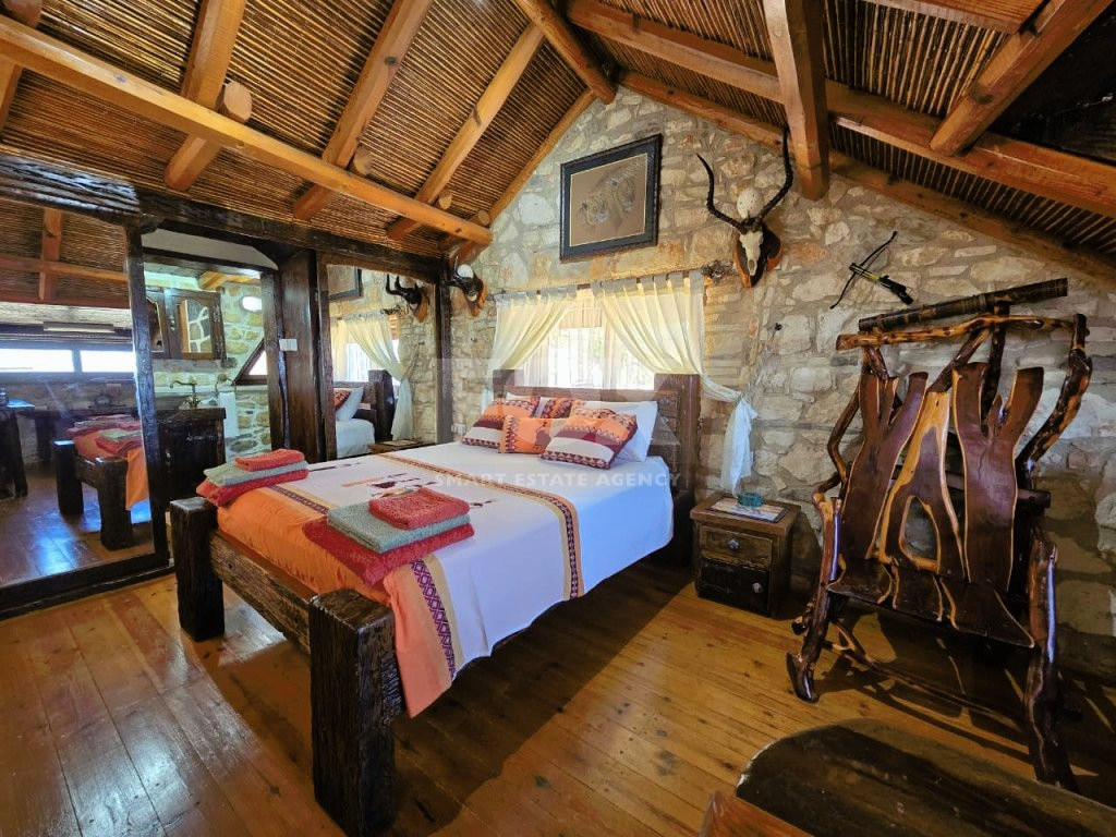 The outdoor spaces are designed to enjoy the natural beauty of the surroundings, enhanced by the rustic charm of the African-themed decor. The entire property was constructed with high standards using stone, solid wood, and glass.