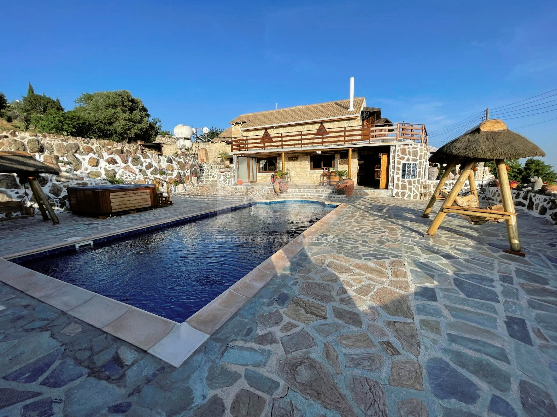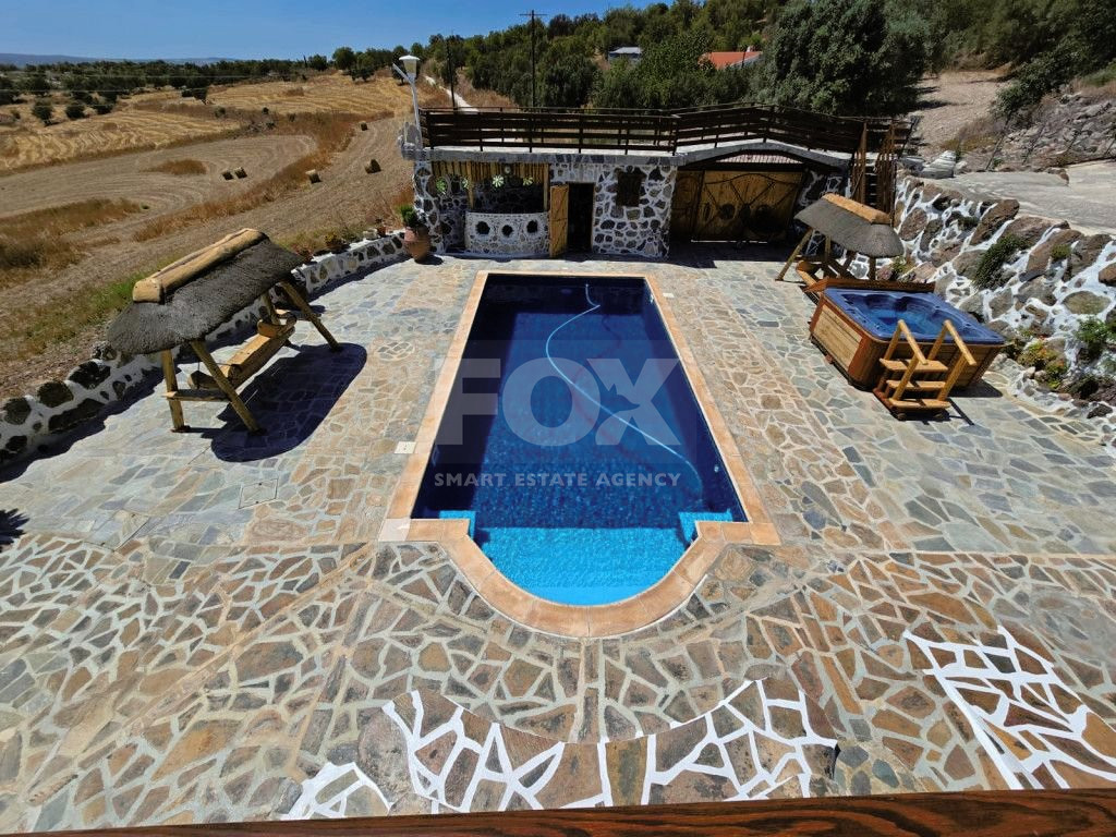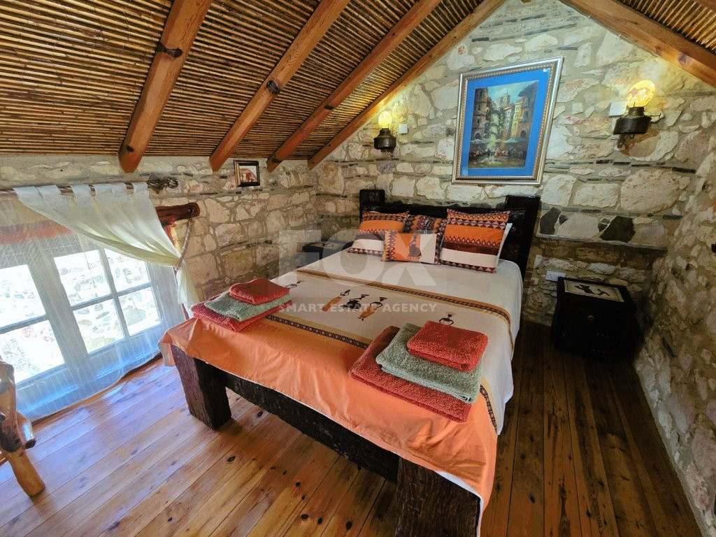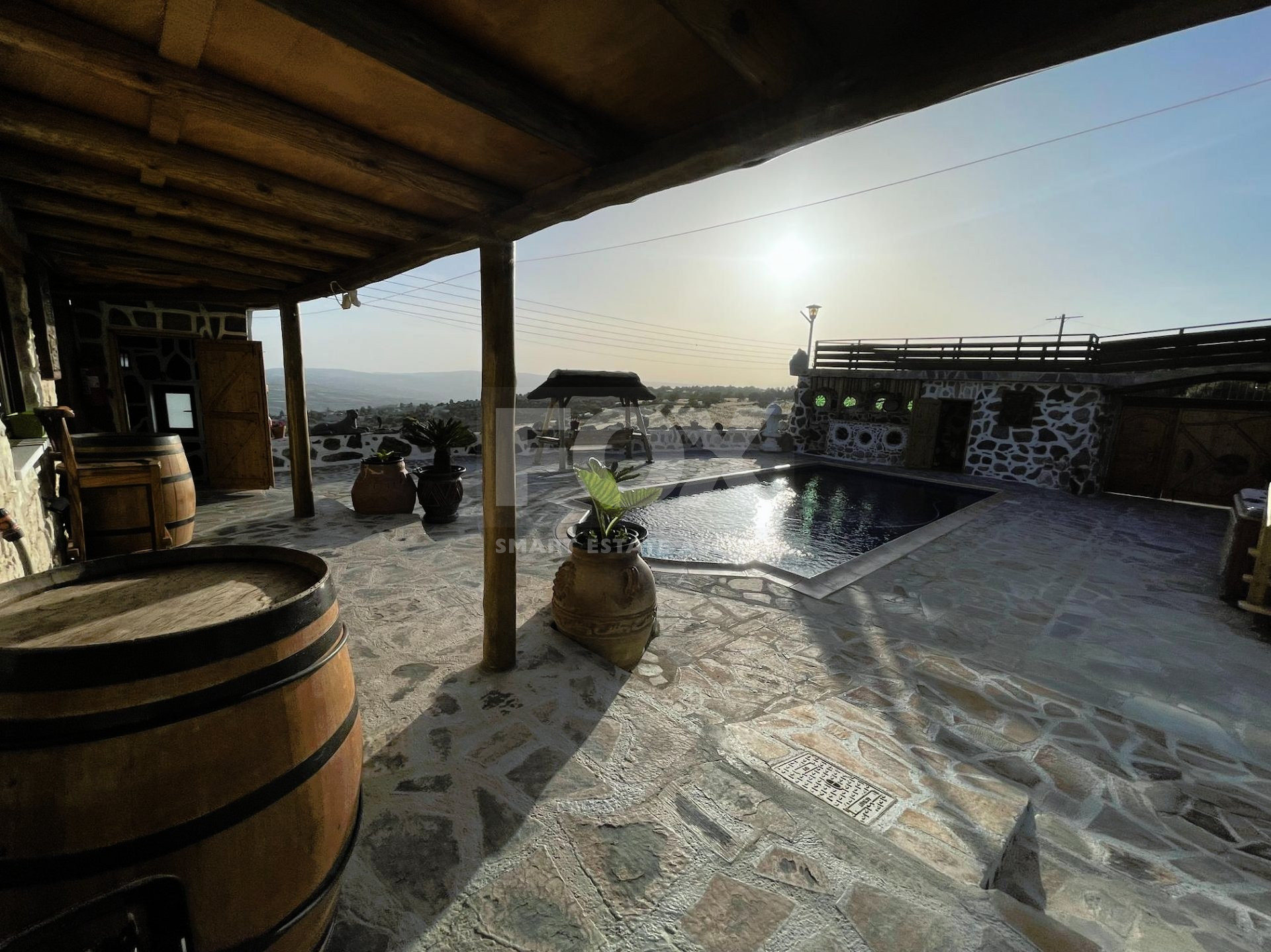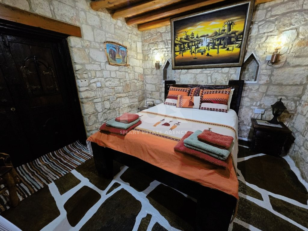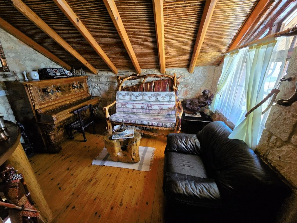 The outdoor spaces are designed to enjoy the natural beauty of the surroundings, enhanced by the rustic charm of the African-themed decor. The entire property was constructed with high standards using stone, solid wood, and glass.