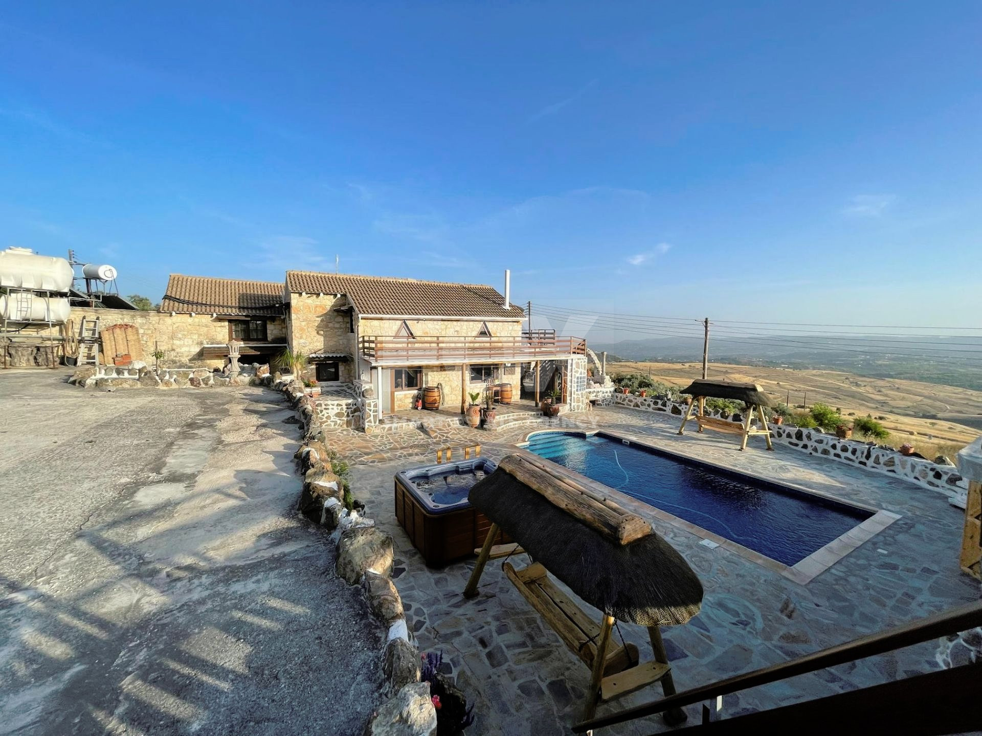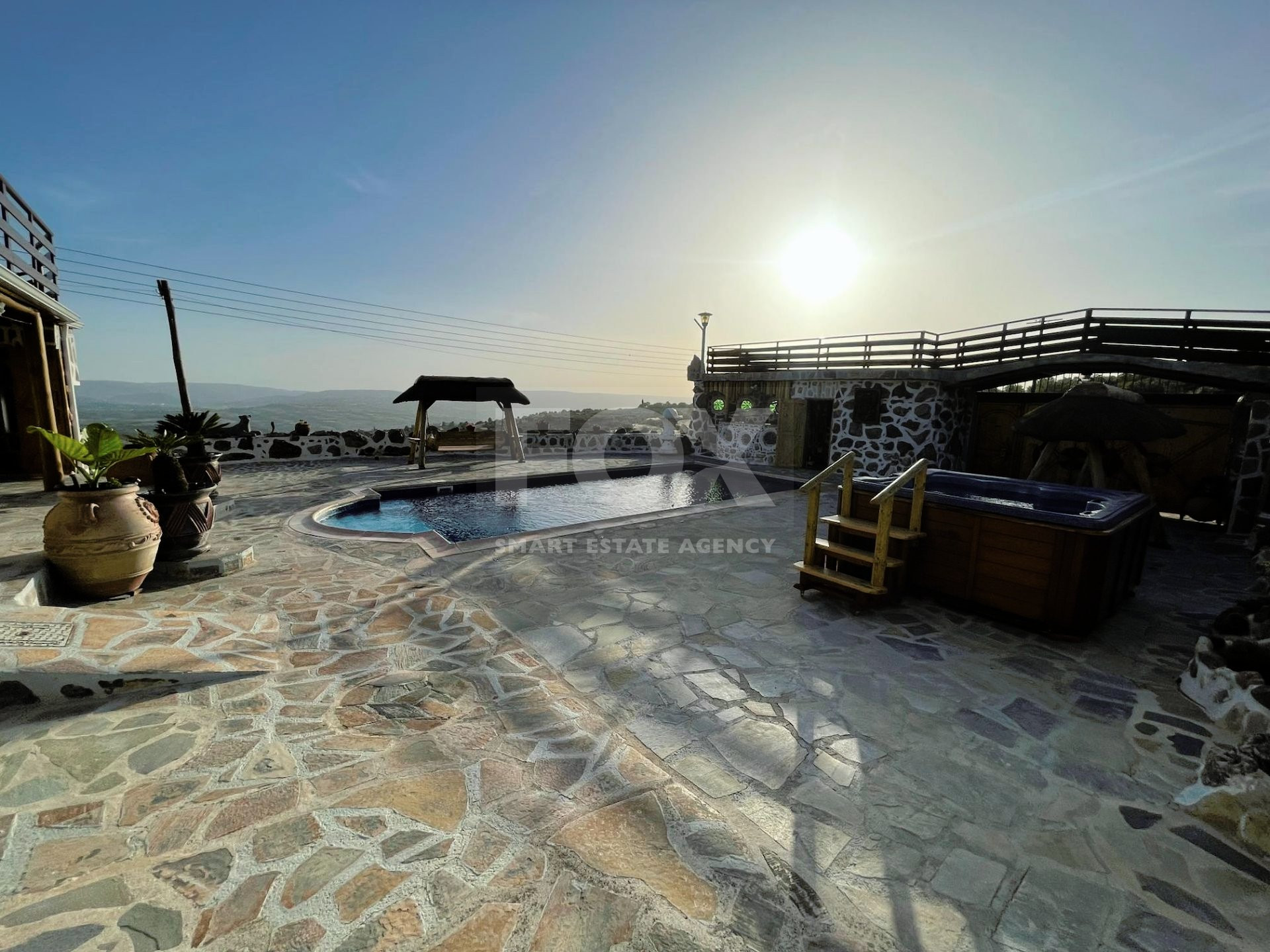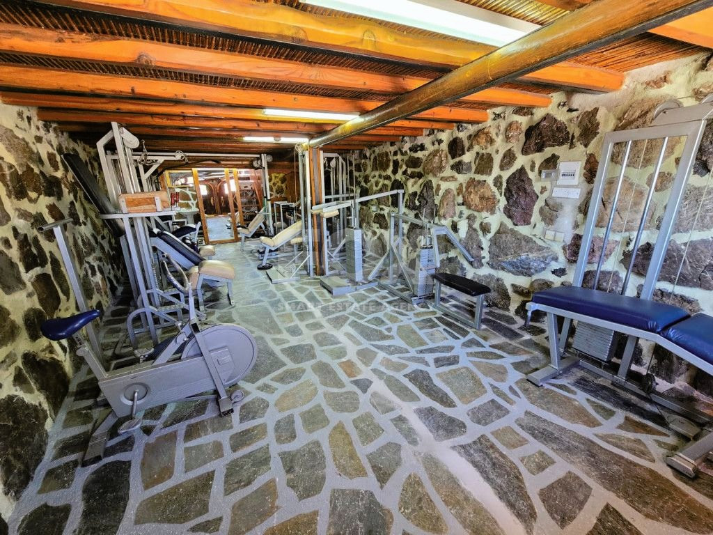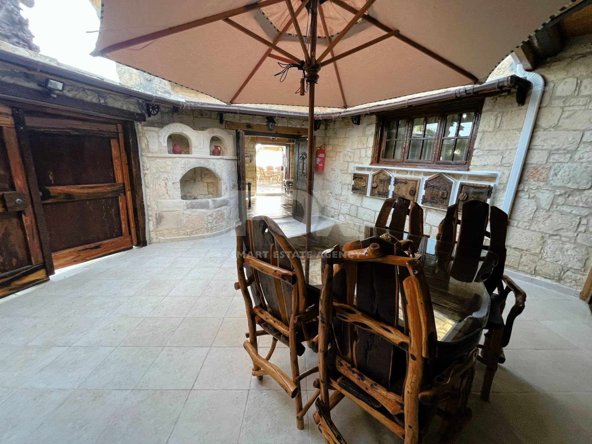 The outdoor spaces are designed to enjoy the natural beauty of the surroundings, enhanced by the rustic charm of the African-themed decor. The entire property was constructed with high standards using stone, solid wood, and glass.