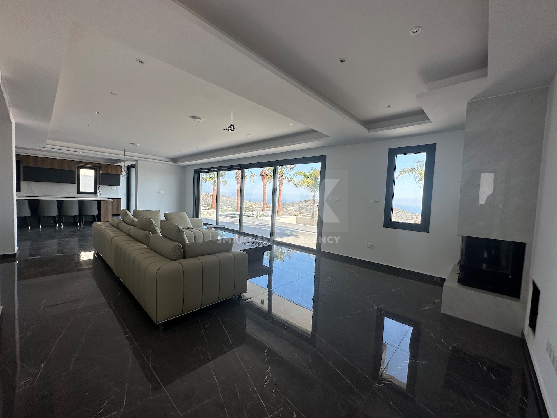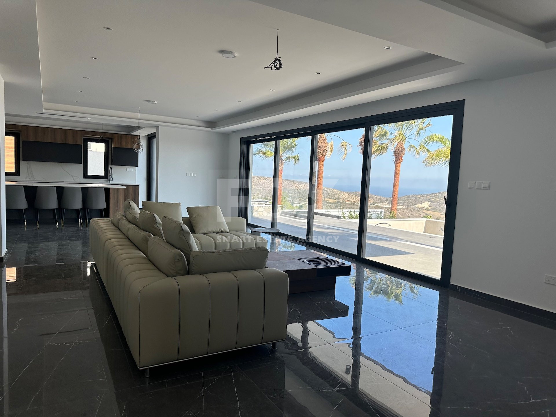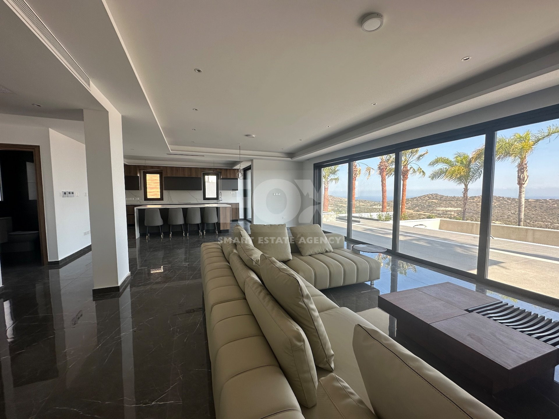 The expansive living room beckons you to unwind in plush seating arrangements while basking in the warm glow of natural light streaming through panoramic windows.