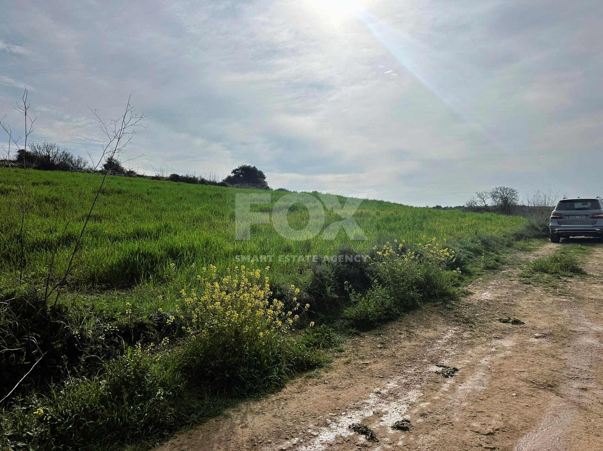 It has a regular shape with a slightly slope surface and it abuts to a dirt road.