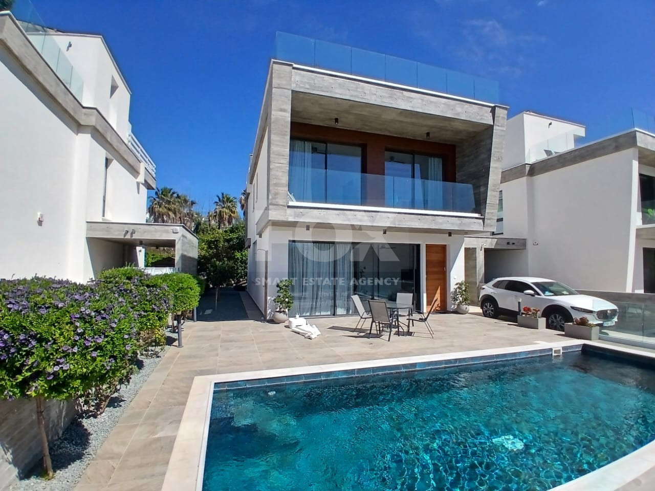 Experience comfort all year round with a central air conditioning system and underfloor heating. Large windows bring in plenty of natural light and offer beautiful sea views from several rooms. Step outside to your private swimming pool, perfect for relaxing or hosting gatherings with family and friends.