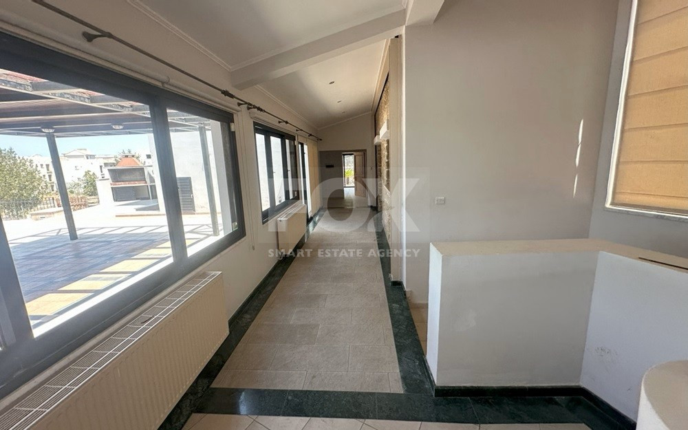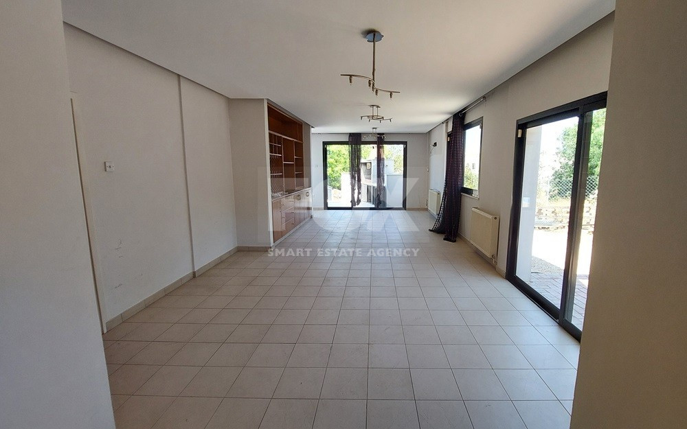 A spacious five-bedroom house in Geroskipou, Paphos, offering 380sqm of living space across three levels. The ground floor includes a kitchen, sitting room, casual dining area, living room, formal dining room, and guest toilet. The first floor features four bedrooms, two with en-suite bathrooms, plus a family bathroom. The basement provides an additional bedroom with private bathroom, a small kitchen, and storage areas.