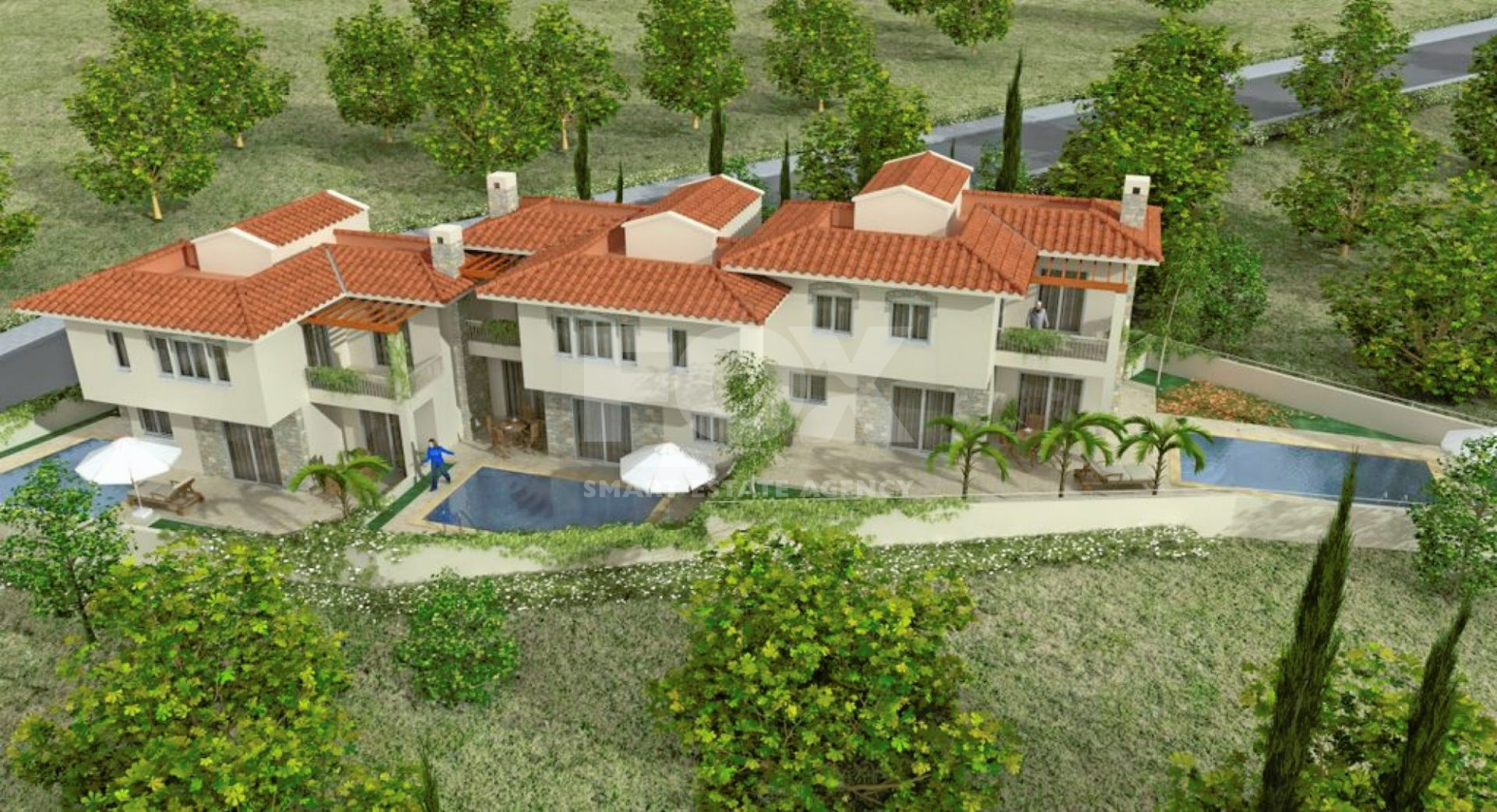 The villa features a master bedroom with an ensuite bathroom, an additional WC, and two more bathrooms. It also includes large tiled balconies and verandas, perfect for relaxing and entertaining. The living area is enhanced by an elegant stonework fireplace, adding warmth and charm. Other features include a private parking area, a private garden, and ample storage space. For those seeking extra luxury, there is an option to include a private swimming pool. Additionally, the villa comes with pergolas that provide shaded outdoor areas for leisure and enjoyment.