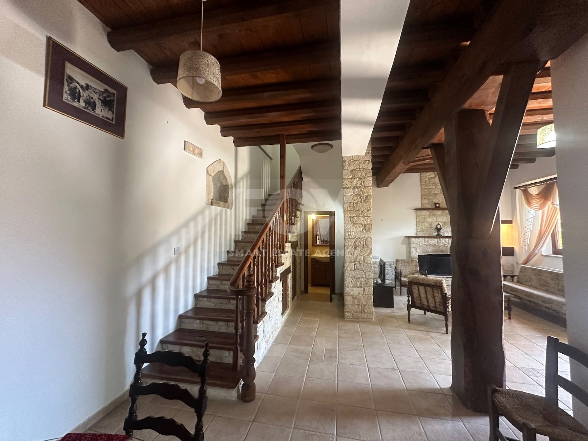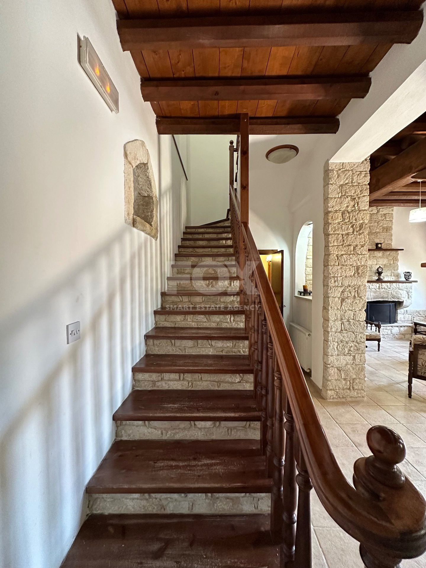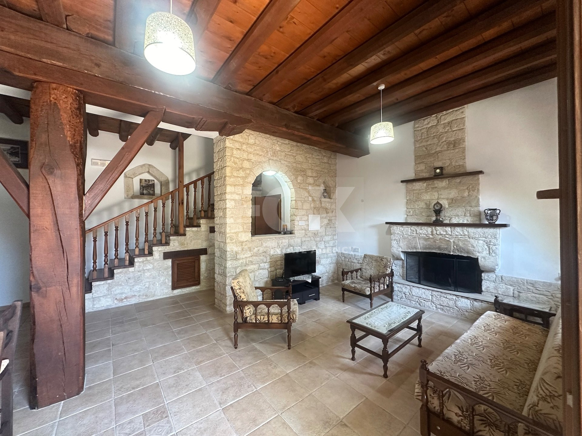 Design: Open-plan kitchen with high-quality appliances, spacious living areas, roof storage, and cozy fireplace.