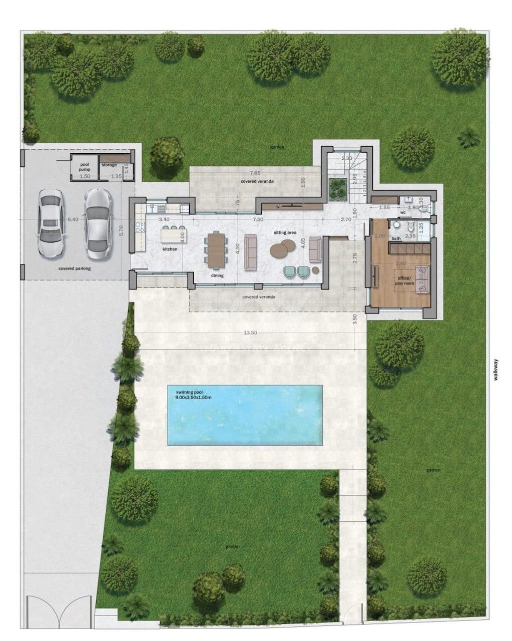 Located in the serene area of Souni, this modern 5-bedroom villa combines luxury living with smart technology and energy efficiency. Set on a generous 941 sqm plot, the home offers 296 sqm of total covered area, including 195 sqm of internal space, 43 sqm of covered balconies, 49 sqm of covered parking, and a 6.2 sqm storage room. An additional 99.7 sqm of uncovered verandas and a private 9 x 3.5 m swimming pool complete the outdoor experience.