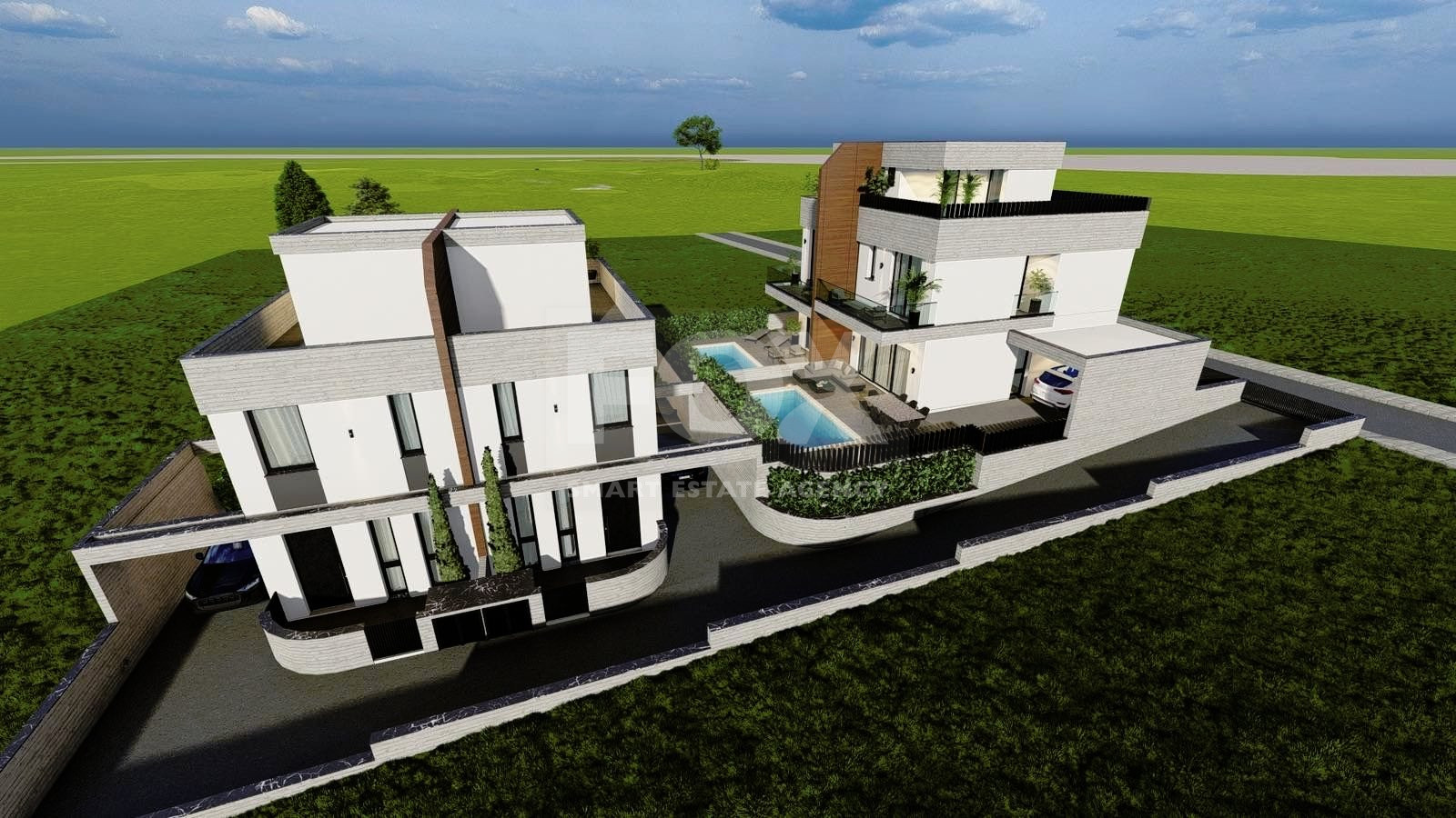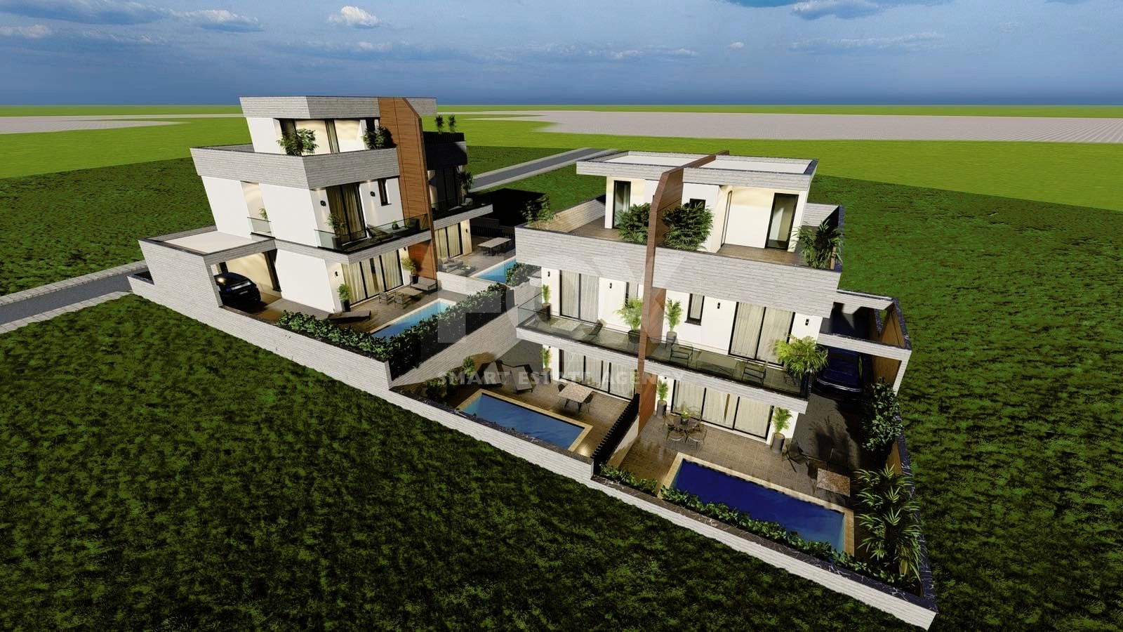 On the first level each house has a nice modern design open plan kitchen with living room and dinning area. Through big sliding windows you have access to the nice back yard which optionally you can have your private swimming pool, barbecue area and the nice garden.