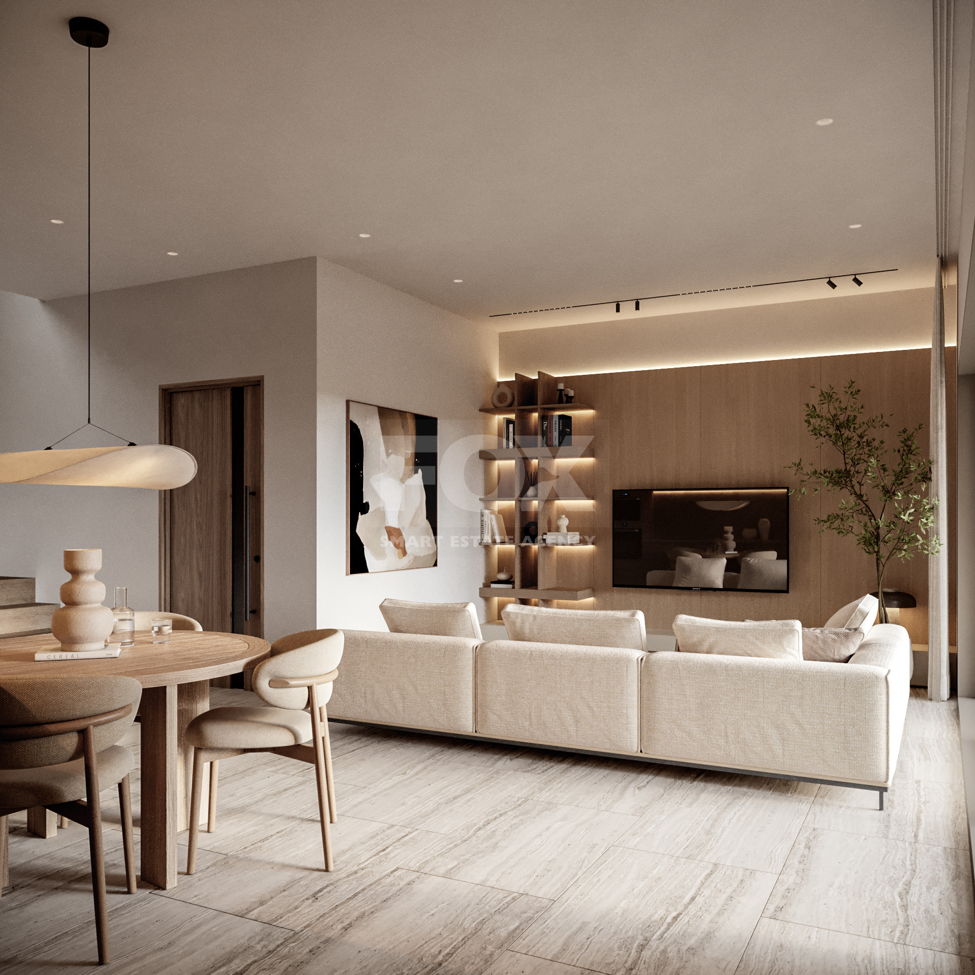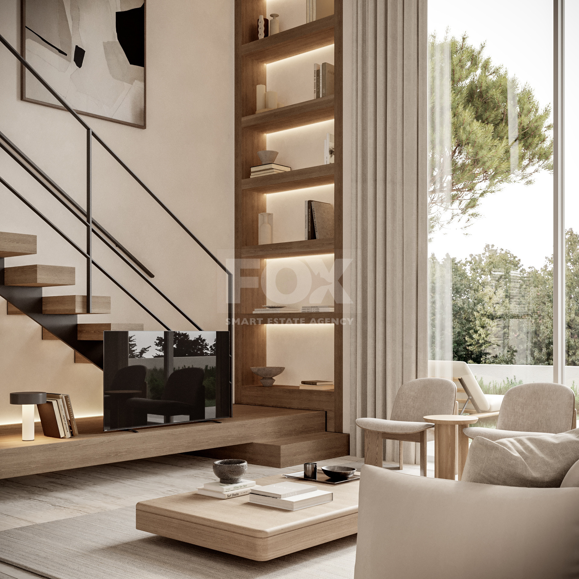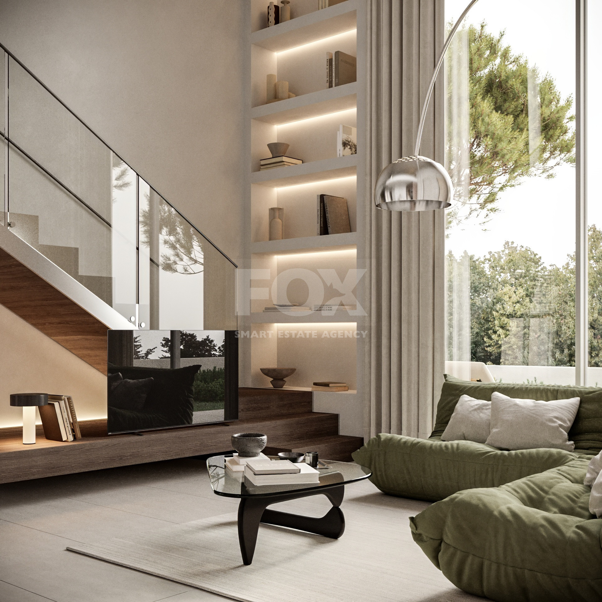 Design Style: Modern architecture with floor-to-ceiling windows, travertine finishes, large tiles, built-in sanitary ware, and concealed air-conditioning for a sleek, light-filled interior.