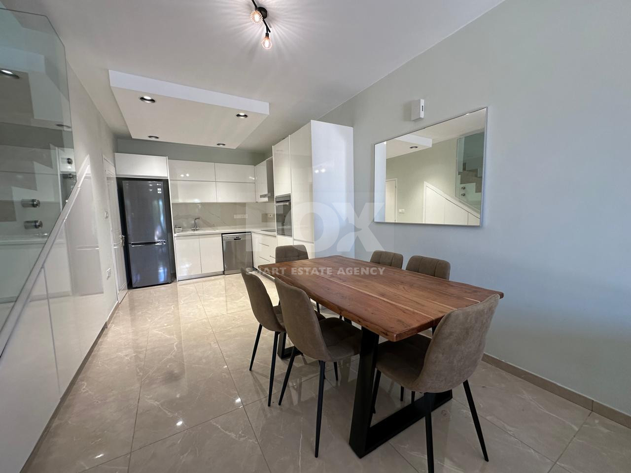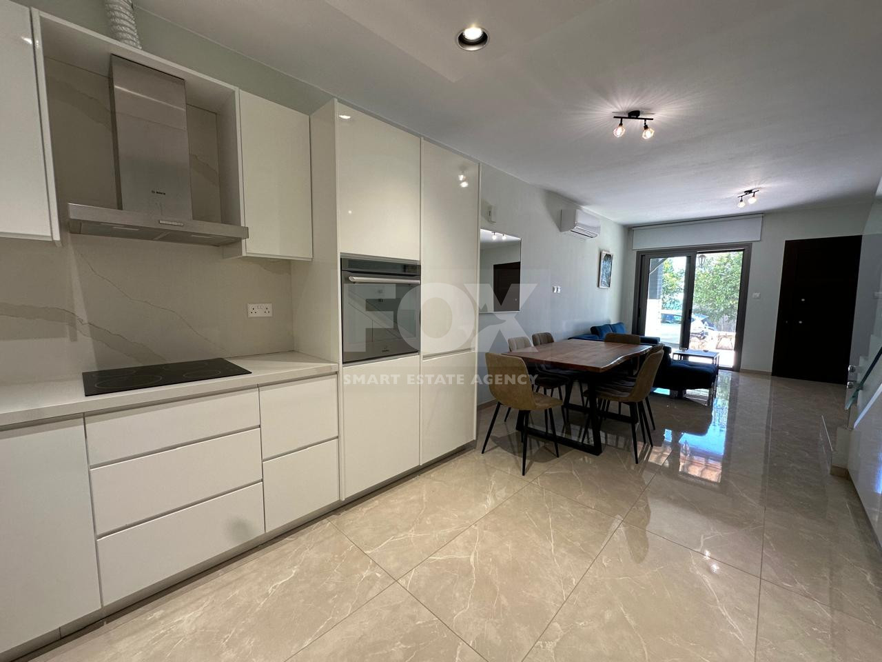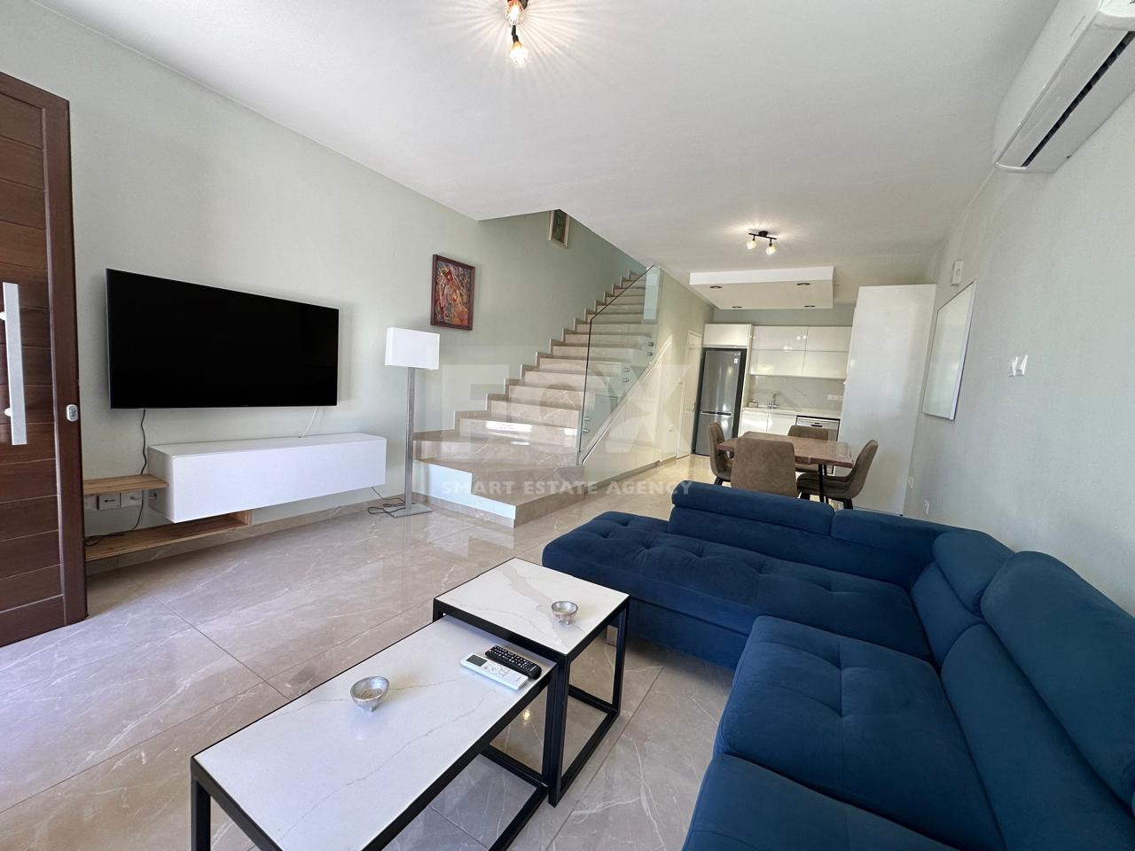 Inside, the home boasts a bright and modern interior with an open-plan kitchen and dining area, fully equipped with appliances. The comfortable living room and two spacious bedrooms are complemented by quality finishes such as marble flooring, laminate details, ceramic tiles, and elegant marble stairs.
