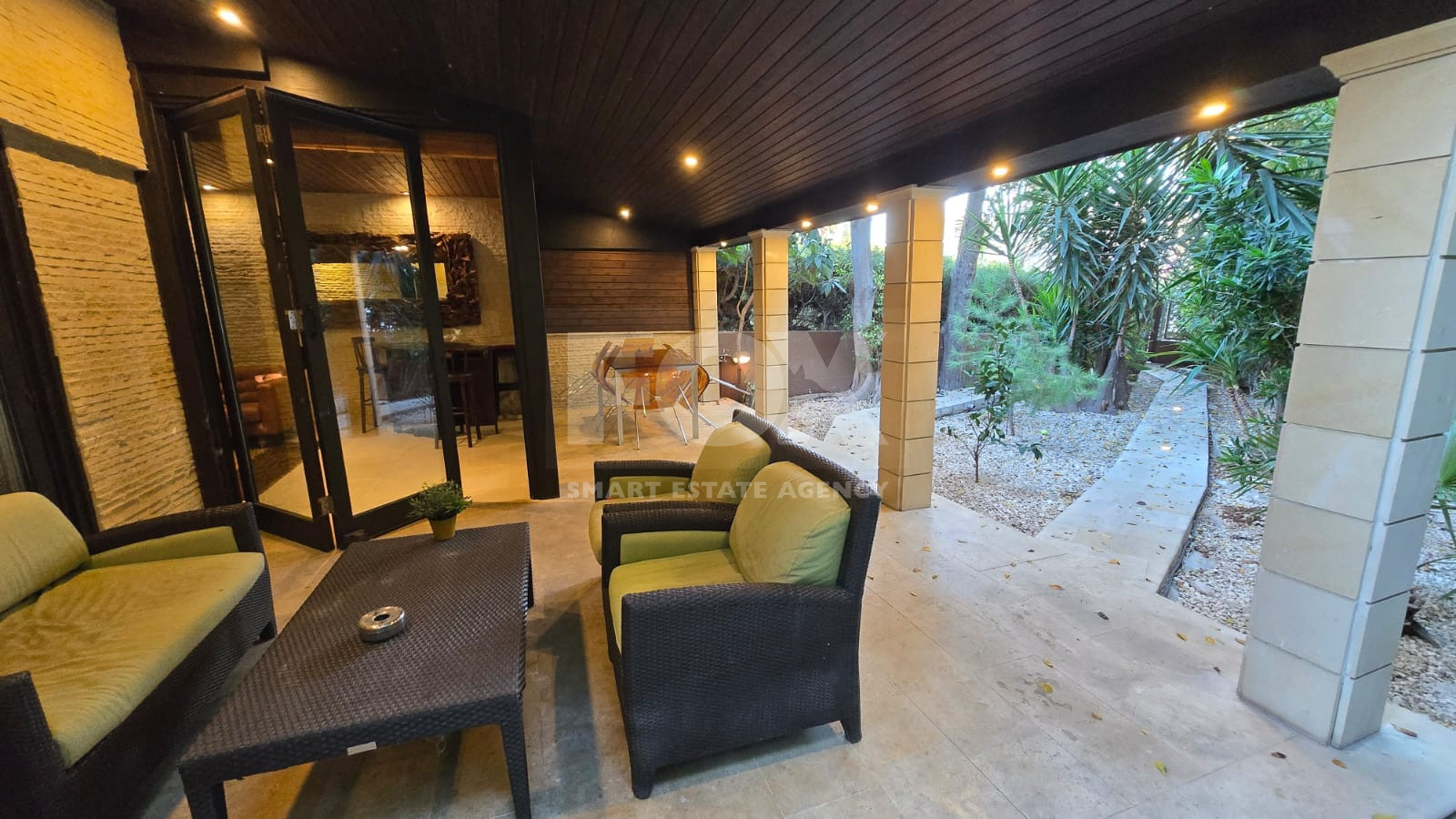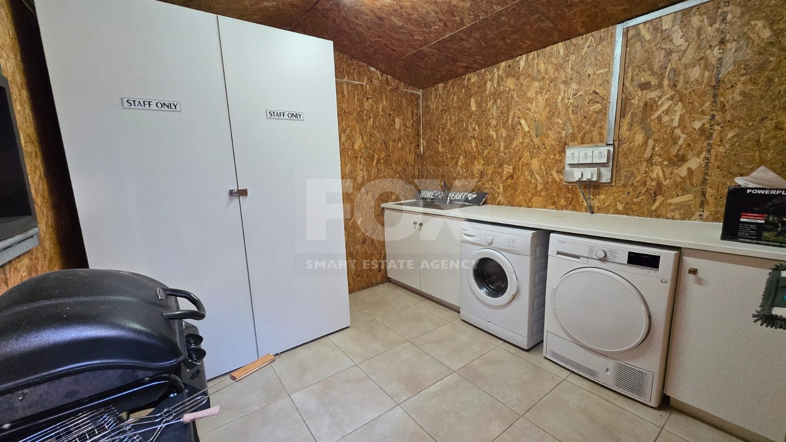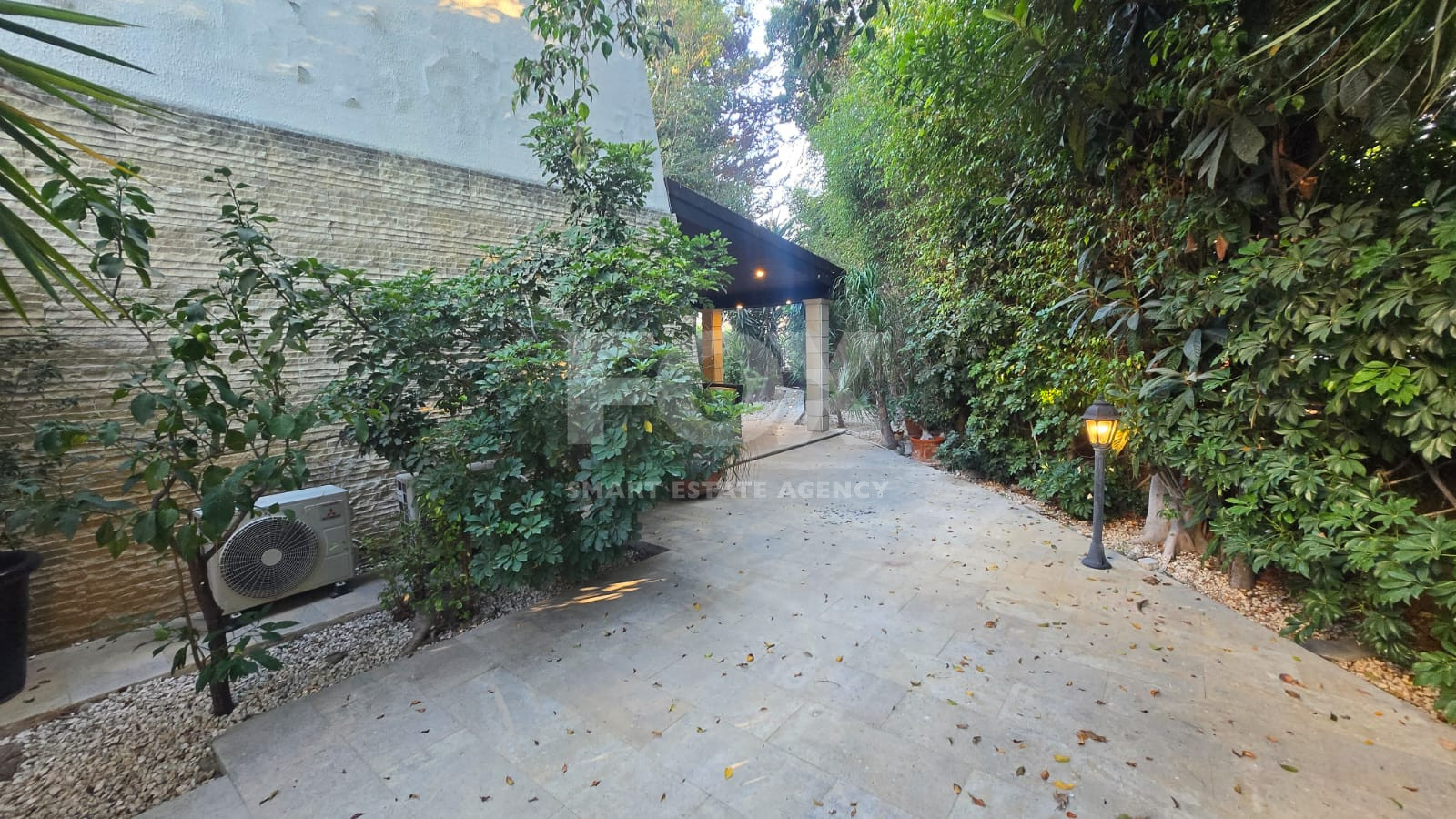 The property offers 80 sq.m. of covered living space, a 10 sq.m. covered pergola, and a spacious 80 sq.m. private yard with a landscaped garden. It also includes an outdoor utility room with a washing machine and storage space.